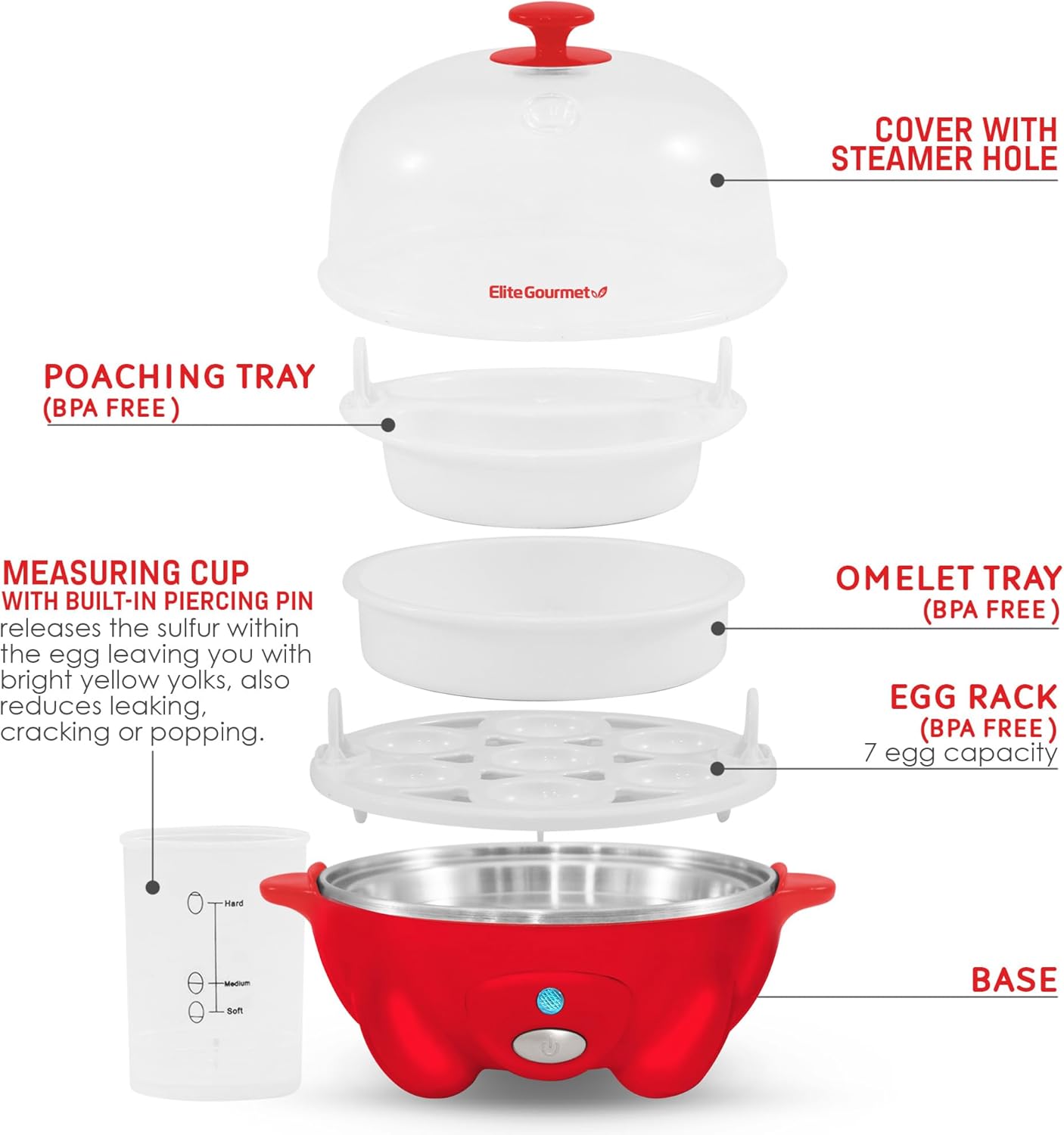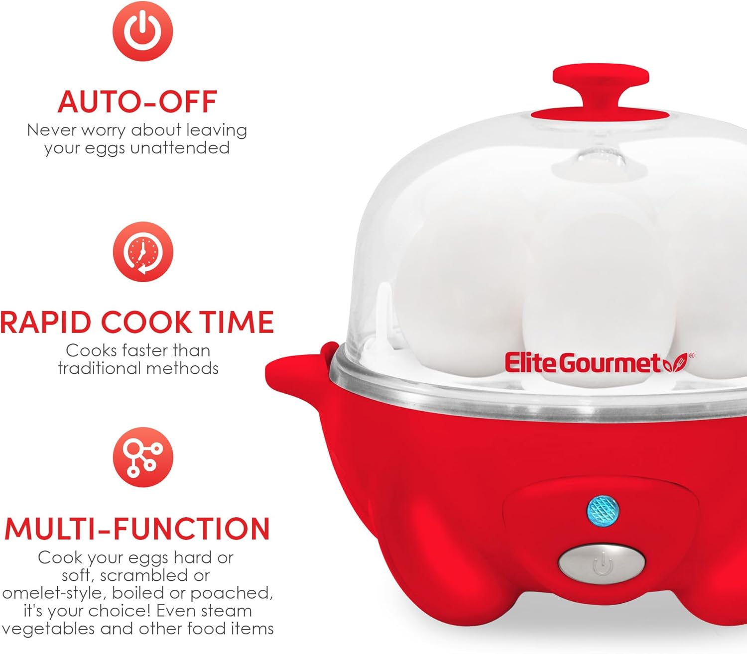 The Elite Gourmet Automatic Easy Egg Cooker allows you to cook up to 7 eggs at one time. Eliminate the guesswork by using the included measuring cup which allows you to calibrate the water level to consistently prepare eggs to your desired style; soft, medium, or hard boiled. In addition to steaming omelets, this egg cooker allows you to gently poach two eggs with the included poaching tray as well as cook scrambled eggs. No more waiting for water to boil on the stove; the convenient automatic shut-off indicator light + audible buzzer alert lets the user know exactly when the cooking cycle is complete to prevent overcooking. The built-in timer adjusts automatically from soft to hard and cooks eggs exactly to your liking! Also included on the measuring cup is a built-in piercing pin to prevent cracked shells during cooking. It also allows you to pierce the eggs prior to cooking to release the sulfur within the egg. The result is consistently perfect golden yellow yolks. Gone are the days of undercooking or overcooking your eggs! Perfect as a back to school gift for dorms, apartments, RV campers, camping, etc. Small and lightweight, it easily fits into drawers for storage or just leave out on the counter as a fun and colorful accent to any home kitchen. Prepare quick and healthy breakfast, meals or even just snacks for the whole family! Designed to make busy mornings easier and to save you time + money. No need to spent $1+ on that hard-boiled egg at the cafeteria, the Elite Gourmet Easy Egg Cooker can quickly boil eggs in the morning while you are brushing your teeth! Just add eggs, water, push the power button and within minutes your eggs will be ready. Using the egg tray handles, hold the egg tray under cold water to rinse and cool down if you need to peel them right away. Using the poaching or omelet tray, top with a bit of tomato, green pepper, and chives for an easy and healthy breakfast. Pair it with toast and avocado for a hearty brunch. Prepare deviled eggs for the office potluck. However, you use the Easy Egg Cooker, we are sure you will love it as much as we love telling you about it! Includes Egg Cooker Base, Dishwasher safe removable parts: egg tray, poaching tray, omelet tray, clear lid, measuring cup and instruction manual with 16 recipes. Voltage of 120V. cETL approved. Do not use outdoors. The Elite Gourmet Easy Egg Cooker is cETL approved and 360 Watts/120V for worry and hassle-free usage. Our customer support team is based in the US and available to answer any questions you may have!